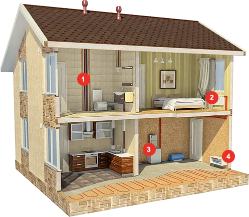 • Система отопления замкнутого типа с жидким теплоносителем, состоящая из трубной разводки и радиаторов.